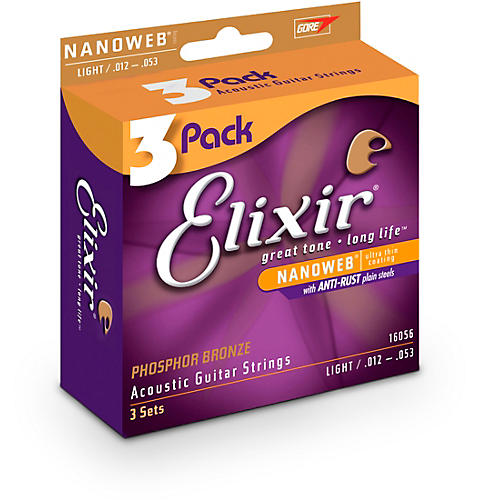 Elixir 16056 Nanoweb Phosphor Bronze Acoustic Guitar Strings 3-Pack - Light (12-53)