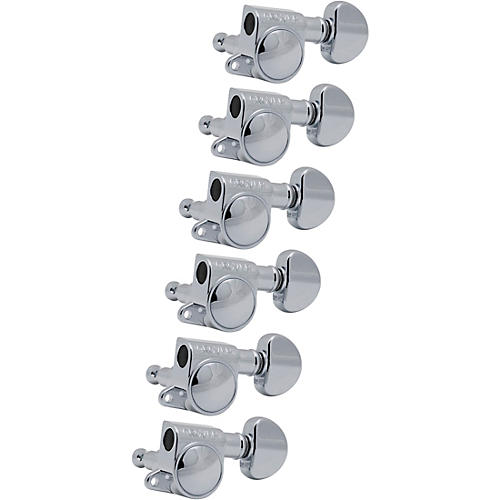 The Grover Mid-Size Roto-Grip Locking Rotomatic tuning machines in a chrome finish provide a lightweight yet sturdy option for inline applications, 12-string guitars, or smaller headstocks. Designed for precise tuning stability, these tuners feature an 18:1 gear ratio for smooth adjustments. Their compact size ensures a comfortable feel while maintaining Grover's trusted durability and reliability.
