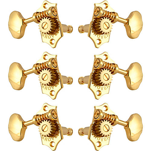 The Grover Sta-Tite 97-18 series tuning machines, like these V97-18GB models, feature a stylish die-cast plate and gold button, which provide smooth, precise tuning for your instrument. With an 18:1 gear ratio, these open gears offer quick string changes and tuning adjustments so you can dial in your perfect sound. The 97-18 series is a drop-in upgrade that installs easily on most guitars, basses and other fretted instruments. Whether you play rock, blues, jazz or metal, the Grover Sta-Tite machines keep your instrument in tune through the most demanding performances. Built to withstand years of regular use, these high-quality tuning machines provide durable, dependable performance for serious musicians. For tuning machines that won't let you down, choose the Grover Sta-Tite 97-18 series.
