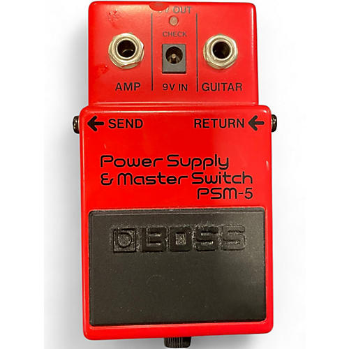 Used BOSS PSM-5 Power Supply Master Switch in fair condition—an all-in-one AC-powered supply and master on/off switch for streamlined pedalboard control. Provides regulated 9V DC power for BOSS compact pedals (and compatible 9V pedals), with multiple DC outputs for daisy-chaining and a built-in courtesy AC outlet for powering an additional device. Shows noticeable cosmetic wear but functions as intended for reliable gigging and practice setups.
