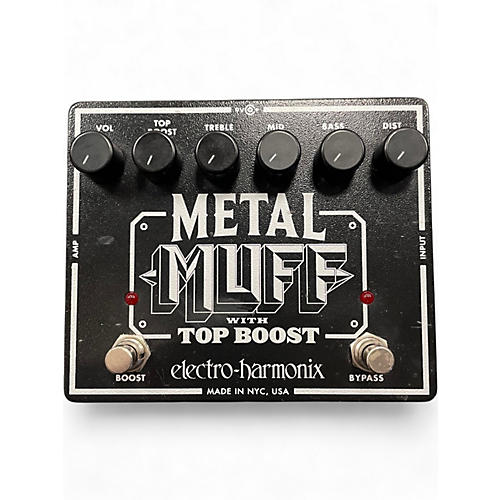 Unleash crushing high-gain tone with this used Electro-Harmonix Metal Muff Distortion with Top Boost in great condition. Designed for modern metal and hard rock, it delivers thick distortion with a 3-band EQ for precise sculpting, plus a footswitchable Top Boost to add extra bite and presence for solos. Standard 1/4" input/output, rugged stompbox build, and flexible tone control make it an easy upgrade for any pedalboard.