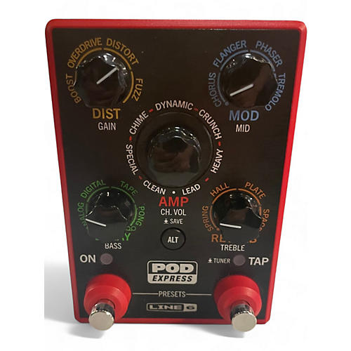 Used Line 6 POD Express Effect Processor in great condition, offering trusted Line 6 amp and effects tones in an ultra-portable stompbox. Dial in inspiring sounds with multiple amp models, cabinet simulations, and built-in effects like drive, modulation, delay, and reverb, with simple footswitch control for stage or studio. Compact and gig-friendly, it provides straightforward editing, onboard presets, and flexible output for connecting to an amp, interface, or PA.