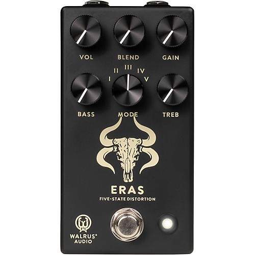Built for tight, high-gain performance, the Walrus Audio Eras five-state distortion pedal delivers aggressive distortion with fast response and precise control over modern drive textures. Reimagined for the Minimal Series with a blacked-out aesthetic, this distortion pedal retains its full feature set, combining five selectable clipping modes with a blend control for shaping everything from focused palm-muted riffs to saturated lead tones. Designed to work as both a standalone distortion and part of a stacked gain setup, the Eras offers a wide range of articulate, high-impact sounds suited for guitar and bass alike.