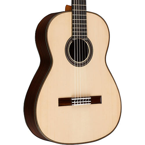 A Spanish cedar neck and ebony fingerboard provide a smooth, confident playing surface with the familiar feel classical guitarists expect. The 650mm scale length and 52mm nut width support accurate left-hand articulation, while a carefully dialed-in setup offers easy playability without sacrificing clarity. Gold Gotoh tuners with an 18:1 ratio ensure precise tuning stability, and the bone nut and saddle help preserve the guitar’s focused, singing response.