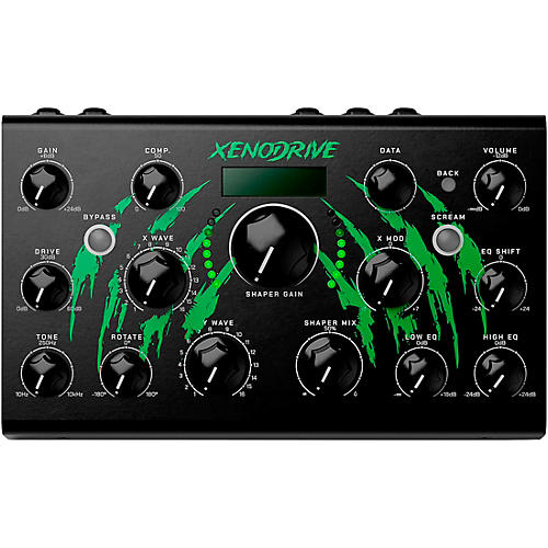 Xenodrive is designed for deep exploration without sacrificing immediacy. Twelve front-panel parameters provide direct control over gain, drive, tone, wave selection, rotation, compression amount, shaper mix, EQ, noise gate and output level, while the OLED display and data encoder handle preset management and advanced configuration. The unit ships with 42 factory presets and supports up to 60 user presets, all savable and recallable directly from the hardware. Features like preset morphing allow smooth transitions between sounds instead of abrupt changes, and the built-in noise gate and stereo EQ help keep even extreme distortion musically usable. A configurable footswitch can bypass, trigger “Scream” mode or navigate presets for hands-free performance control.