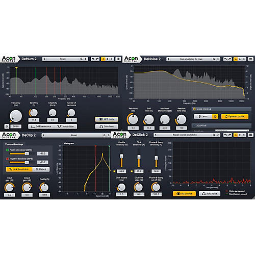 DeNoise 2, DeClick 2 and DeHum 2 now support Mid/Side (M/S) processing, which can reduce unwanted fluctuations in the stereo image. The core algorithm in DeClick 2 received major improvements and now better preserves transients and can be pushed to higher click and crackle sensitivities without introducing artifacts. Also, all the plug-ins in the suite now support surround and immersive audio formats up to 7.1.6 channels.Acon Digital Restoration Suite 2 is available as VST, VST3 or AAX for both Windows and Mac or as AU plug-ins for Mac. There are 32- and 64-bit versions for Windows and the Mac version is 64-bit.