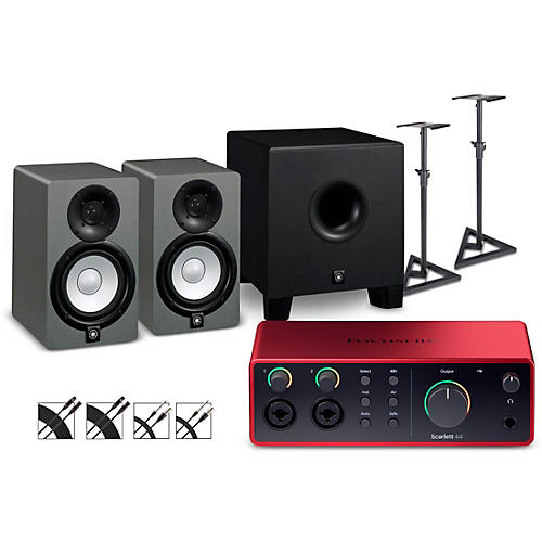 The Focusrite Scarlett 4i4 4th Gen with Yamaha HS Series studio monitor pair & HS8S subwoofer bundle comes with everything you need to build a professional-grade home studio setup. At the heart of it all is the Scarlett 4i4 4th Gen audio interface, loaded with four studio-quality mic preamps, pristine converters and flexible I/O. You'll get the renowned transparency of Yamaha HS Series monitors, plus an HS8S subwoofer for immersive low end. Rounding it out are cables, stands and an industry-leading software bundle—this powerhouse package truly has it all.