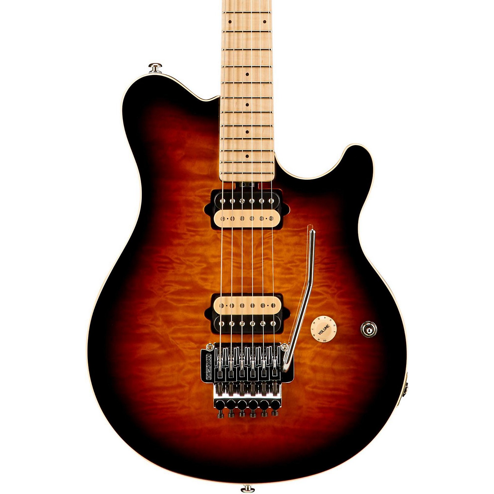 A basswood body with a bookmatched figured maple top gives this Music Man an especially elegant look. Its select maple neck is attached with 5 bolts for perfect alignment and no shifting. The joint is sculpted and neck plate flush mounted to allow smooth access to the highest frets. Pickups are 2 custom DiMarzio humbuckers with 3-way switching. Schaller tuners with pearl buttons. Music Man Floyd Rose-licensed locking tremolo (lowers pitch only). Includes a Music Man hardshell case.