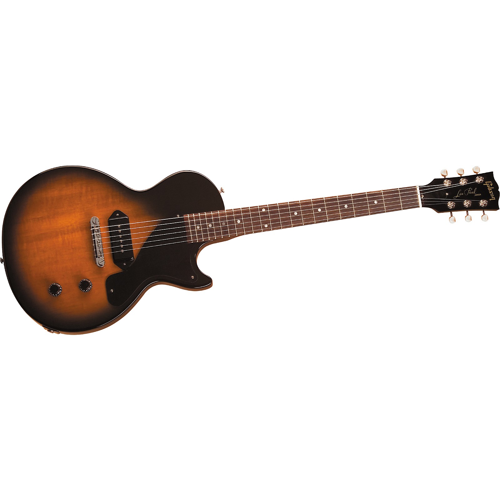Introduced in '55 as an affordable alternative to the Les Paul's carved-top luxury, the Gibson Les Paul Junior Electric Guitar -- a one-pickup, flattop cruisin' machine -- caught on quickly and climbed right into guitar legend. The set neck and compensated wraparound bridge/tailpiece provide solid intonation and vibrant resonance. The single dog-ear P-90 pickup dishes out single-coil high definition with added punch-- beautiful electric guitar tone through a lightly or heavily pushed amp. Rosewood fretboard with 22 frets and dot inlays. Mahogany body and neck. Chrome hardware.