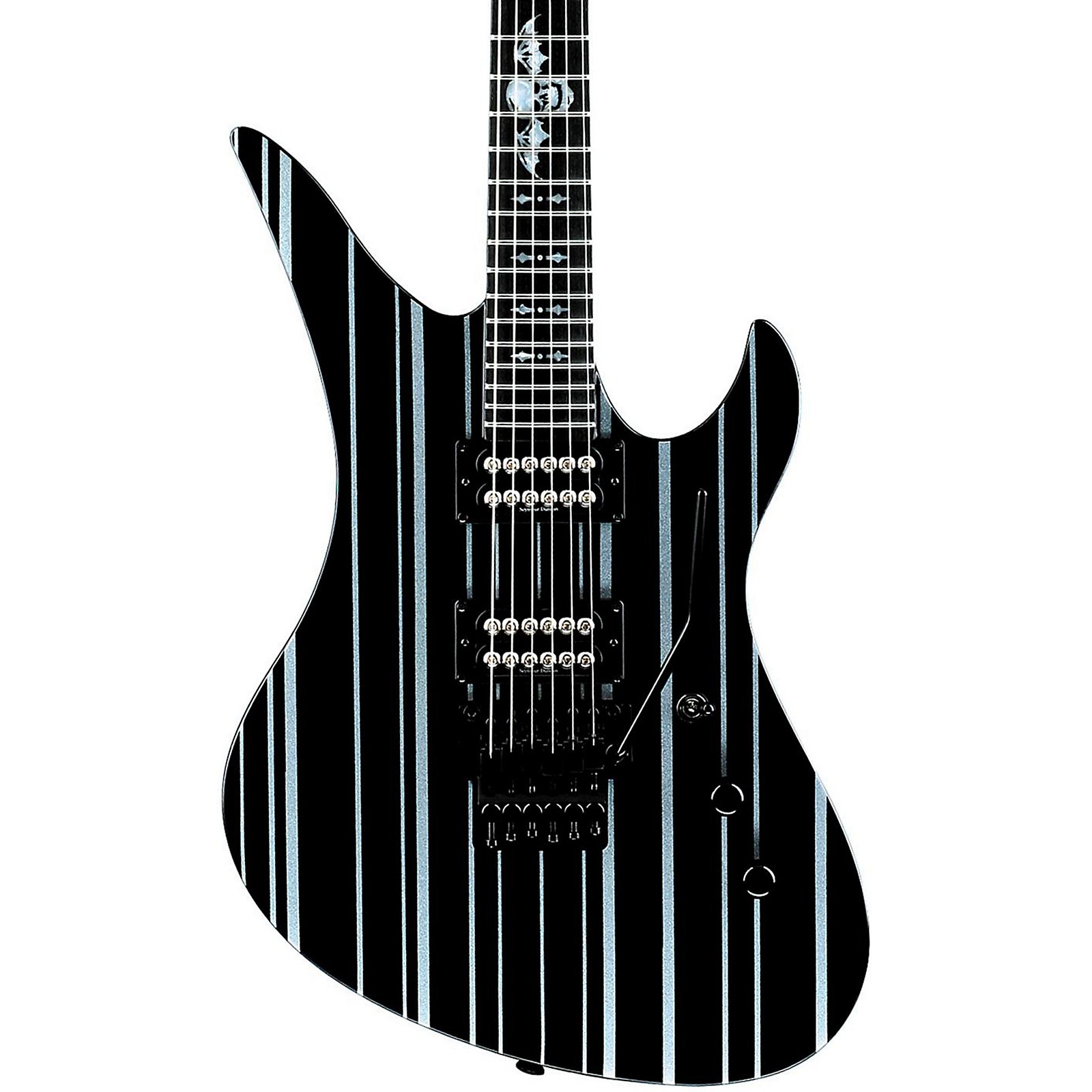 Designed to replicate the guitar Synyster plays onstage, the Schecter Synyster Custom Electric Guitar boasts outrageously heavy tone. It has a mahogany body, set mahogany neck, 25-1/2" scale, ebony fretboard, 2 custom Seymour Duncan Custom Invader pickups, and a Floyd Rose Original locking tremolo that lets you execute the most subtle tremolo or wildest dive-bombing effects and return to perfect tuning every time.tremolo. Special Synyster touches include Deathbat fretboard inlays with SYN in gothic lettering and a gloss-black finish with silver pin stripes.